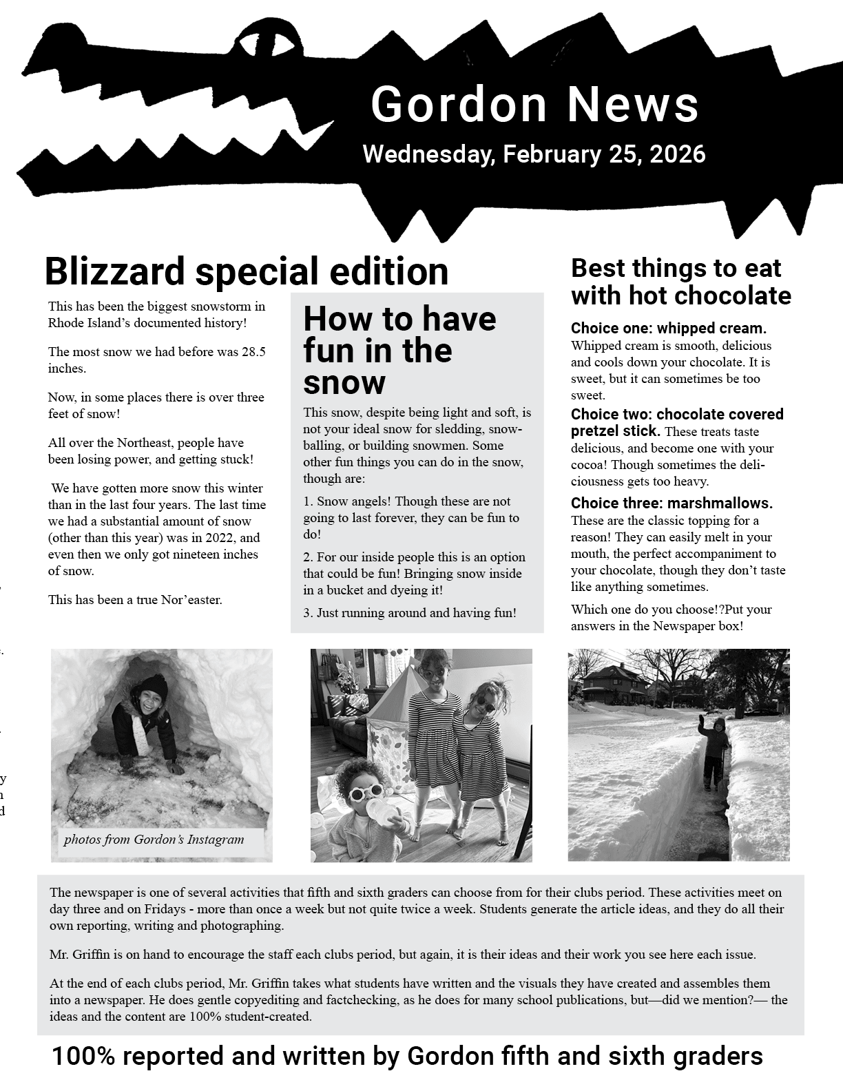 The Blizzard of 2026 kept Gordon closed for three days. The fifth and sixth grade newspaper filed this report from the comfort of their homes: